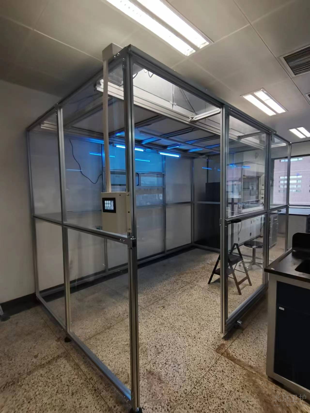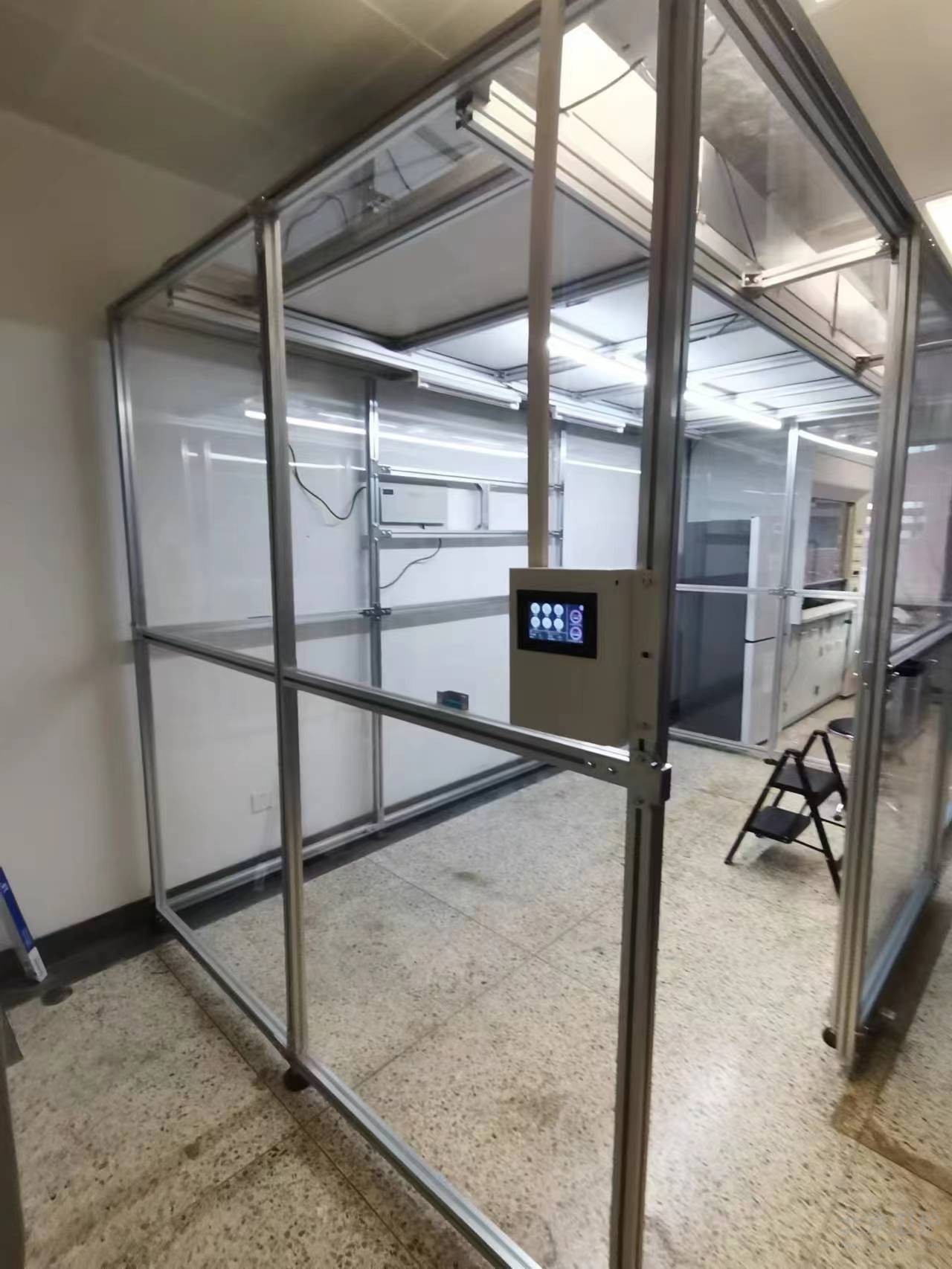 9月份我公司接到此項目后便抓緊時間出具相關(guān)方案、設(shè)計圖紙,經(jīng)過不斷的溝通和改動,最終確定施工方案。此單位潔凈棚設(shè)計面積20平米,主體材質(zhì)為鋁型材,隔離板使用亞格力板,頂部配有紫外線燈輔助殺菌,過濾系統(tǒng)為百級凈化模塊,并配有我公司研發(fā)的控制系統(tǒng)。從最初的方案設(shè)計、安裝施工,到最后的驗收,總工期為10個工作日。