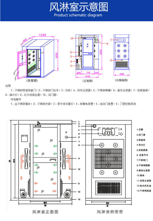 產(chǎn)品簡介:風淋室室人員進出潔凈室的必經(jīng)通道,通用性強。主要用于電子加工、半導體行業(yè)、食品、飲料、生物、醫(yī)療等行業(yè)。是食品、飲料、生物、醫(yī)療行業(yè)QSGMP認證必須使用產(chǎn)品。除人物表面附著塵埃的同事起到氣閘的作用。風淋室是防止未經(jīng)凈化的空氣進入潔凈區(qū)域的凈化設備。